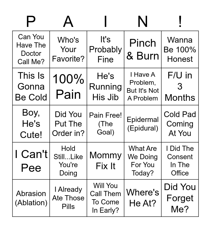 This bingo card has a free space and 24 words: Hold Still...Like You're Doing, I Already Ate Those Pills, He's Running His Jib, Abrasion (Ablation), Wanna Be 100% Honest, Can You Have The Doctor Call Me?, This Is Gonna Be Cold, Who's Your Favorite?, Epidermal (Epidural), Mommy Fix It, I Have A Problem, But It's Not A Problem, Boy, He's Cute!, What Are We Doing For You Today?, I Did The Consent In The Office, 100% Pain, Where's He At?, Cold Pad Coming At You, It's Probably Fine, F/U in 3 Months, Did You Put The Order in?, Did You Forget Me?, I Can't Pee, Pinch & Burn and Will You Call Them To Come In Early?.