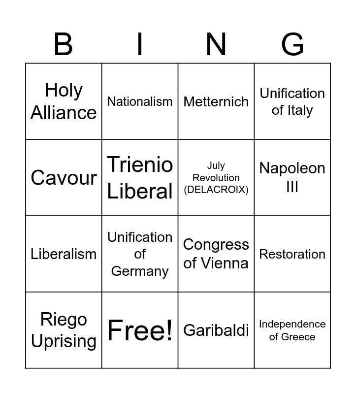 This bingo card has 16 words: Free!, Restoration, Metternich, Holy Alliance, Liberalism, Nationalism, Congress of Vienna, Garibaldi, Cavour, Trienio Liberal, Riego Uprising, Unification of Italy, Unification of Germany, Napoleon III, July Revolution (DELACROIX) and Independence of Greece.