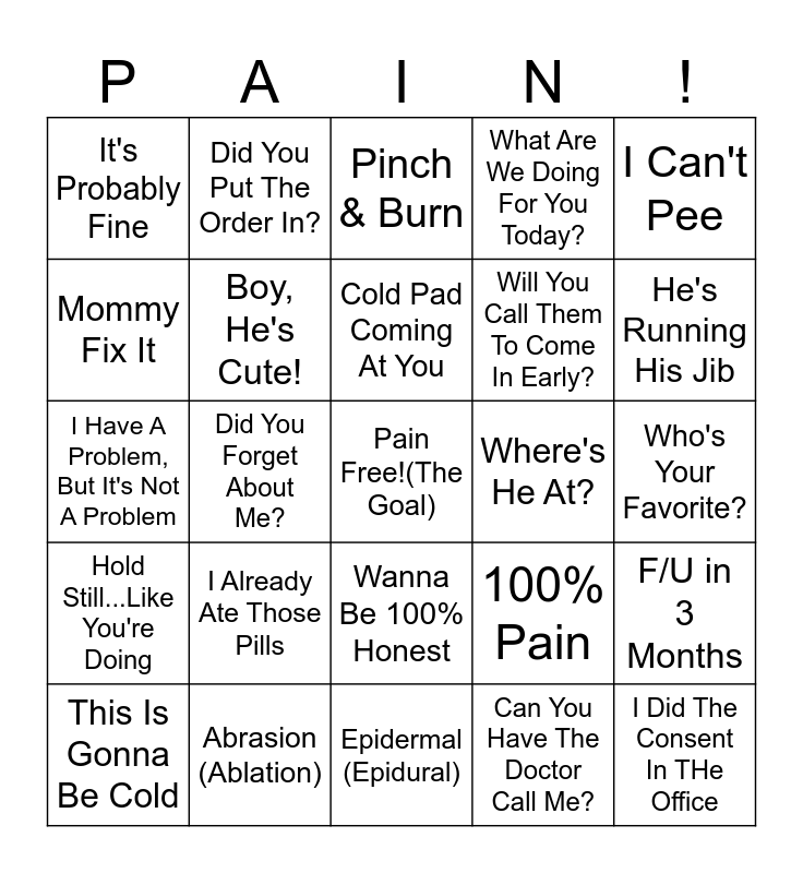 This bingo card has a free space and 24 words: I Already Ate Those Pills, Abrasion (Ablation), Cold Pad Coming At You, This Is Gonna Be Cold, I Can't Pee, It's Probably Fine, Mommy Fix It, Did You Put The Order In?, Where's He At?, Wanna Be 100% Honest, Will You Call Them To Come In Early?, I Have A Problem, But It's Not A Problem, 100% Pain, F/U in 3 Months, Boy, He's Cute!, Can You Have The Doctor Call Me?, Who's Your Favorite?, Pinch & Burn, He's Running His Jib, Did You Forget About Me?, I Did The Consent In THe Office, Hold Still...Like You're Doing, What Are We Doing For You Today? and Epidermal (Epidural).