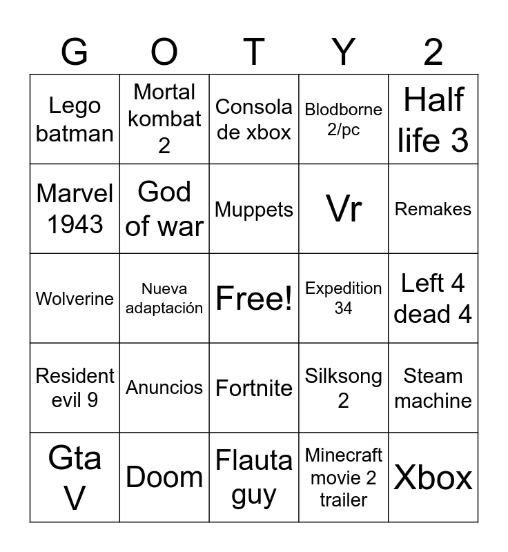 This bingo card has a free space and 24 words: Gta V, Anuncios, Muppets, Minecraft movie 2 trailer, Half life 3, Lego batman, Mortal kombat 2, Consola de xbox, Expedition 34, Left 4 dead 4, Wolverine, God of war, Silksong 2, Steam machine, Marvel 1943, Doom, Flauta guy, Blodborne 2/pc, Remakes, Resident evil 9, Nueva adaptación, Fortnite, Vr and Xbox.