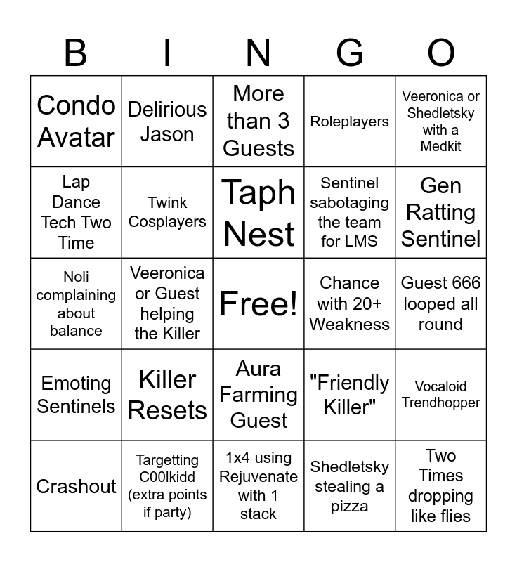 This bingo card has a free space and 24 words: Killer Resets, Targetting C00lkidd (extra points if party), Taph Nest, Crashout, Veeronica or Shedletsky with a Medkit, Condo Avatar, Lap Dance Tech Two Time, Delirious Jason, Chance with 20+ Weakness, Aura Farming Guest, Sentinel sabotaging the team for LMS, Noli complaining about balance, "Friendly Killer", Vocaloid Trendhopper, Twink Cosplayers, Shedletsky stealing a pizza, Guest 666 looped all round, More than 3 Guests, Gen Ratting Sentinel, Veeronica or Guest helping the Killer, Two Times dropping like flies, Emoting Sentinels, Roleplayers and 1x4 using Rejuvenate with 1 stack.