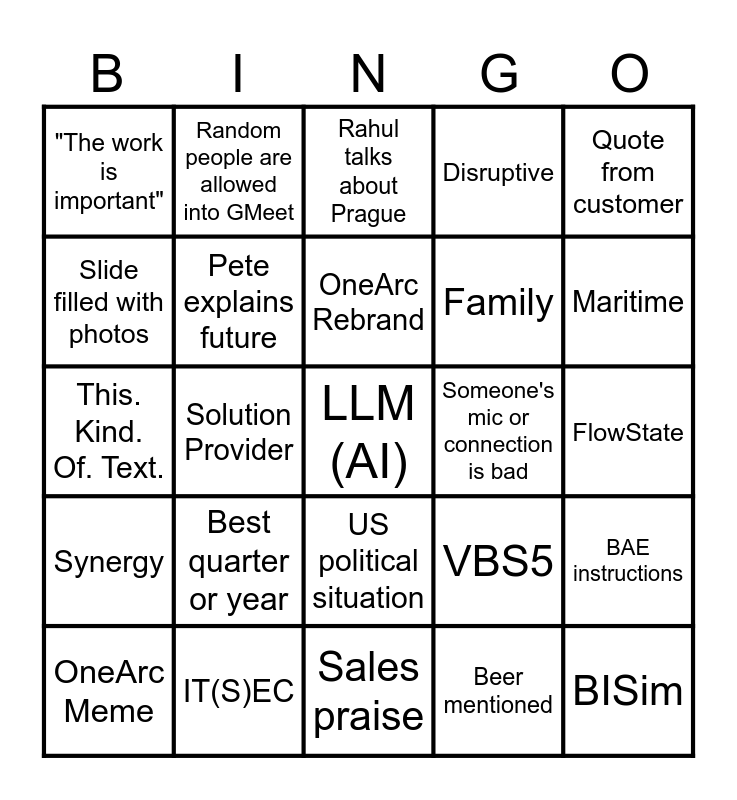 This bingo card has 25 words: Best quarter or year, Sales praise, OneArc Rebrand, OneArc Meme, Quote from customer, "The work is important", Slide filled with photos, Random people are allowed into GMeet, Someone's mic or connection is bad, US political situation, Family, This. Kind. Of. Text., VBS5, BAE instructions, Pete explains future, BISim, FlowState, Rahul talks about Prague, Maritime, Solution Provider, LLM (AI), IT(S)EC, Synergy, Disruptive and Beer mentioned.