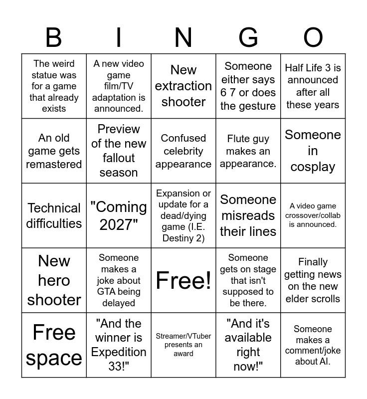 This bingo card has 26 words: Free!, "And it's available right now!", Confused celebrity appearance, "And the winner is Expedition 33!", Half Life 3 is announced after all these years, The weird statue was for a game that already exists, An old game gets remastered, A new video game film/TV adaptation is announced., A video game crossover/collab is announced., Someone gets on stage that isn't supposed to be there., Flute guy makes an appearance., Technical difficulties, Finally getting news on the new elder scrolls, Free space, "Coming 2027", Assassin's Creed Shadows wins an award, Someone either says 6 7 or does the gesture, New hero shooter, New extraction shooter, Expansion or update for a dead/dying game (I.E. Destiny 2), Someone in cosplay, Streamer/VTuber presents an award, Someone misreads their lines, Someone makes a joke about GTA being delayed, Preview of the new fallout season and Someone makes a comment/joke about AI..