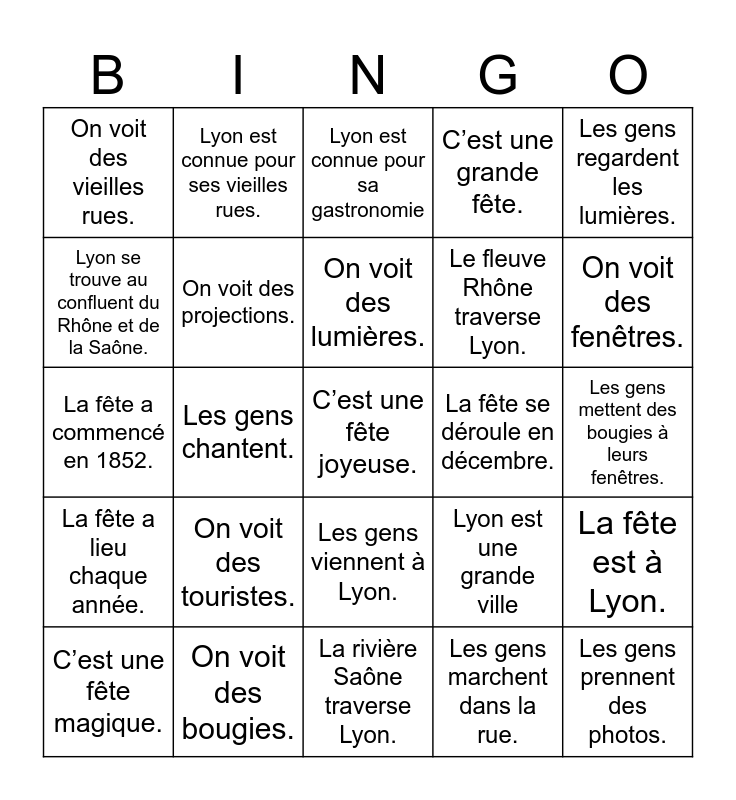 This bingo card has a free space and 27 words: Lyon est une grande ville, Lyon est dans le sud-est de la France., Le fleuve Rhône traverse Lyon., La rivière Saône traverse Lyon., Lyon se trouve au confluent du Rhône et de la Saône., Lyon est connue pour sa gastronomie, Lyon est connue pour ses vieilles rues., La fête a lieu chaque année., La fête se déroule en décembre., La fête est à Lyon., La fête a commencé en 1852., C’est une grande fête., C’est une fête magique., On voit des bougies., On voit des fenêtres., On voit des maisons., On voit des projections., On voit des lumières., On voit des touristes., On voit des vieilles rues., Les gens mettent des bougies à leurs fenêtres., Les gens marchent dans la rue., Les gens chantent., Les gens prennent des photos., Les gens viennent à Lyon., Les gens regardent les lumières. and Les gens regardent les projections..