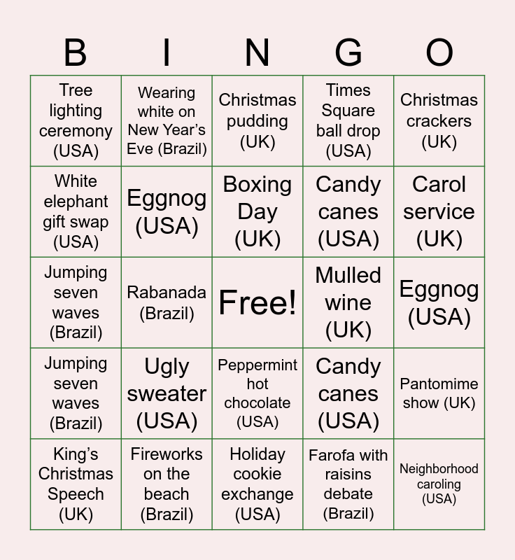 This bingo card has a free space and 60 words: Wearing white on New Year’s Eve (Brazil), Fireworks on the beach (Brazil), Panettone (Brazil), Jumping seven waves (Brazil), Farofa with raisins debate (Brazil), Ugly sweater (USA), Eggnog (USA), Gingerbread house (USA), Candy canes (USA), Secret Santa (USA), Times Square ball drop (USA), Holiday light displays (USA), White elephant gift swap (USA), Peppermint hot chocolate (USA), Holiday cookie exchange (USA), Tree lighting ceremony (USA), Neighborhood caroling (USA), Christmas crackers (UK), Mince pies (UK), Boxing Day (UK), Mulled wine (UK), Christmas pudding (UK), King’s Christmas Speech (UK), Pantomime show (UK), Christmas jumper (UK), Roast turkey with all the trimmings (UK), Stir-up Sunday (UK), Mince pie for Santa (UK), Carol service (UK), Las Posadas (Mexico), Piñata (Mexico), 12 grapes at midnight (Mexico), Rosca de Reyes (Mexico), Ponche navideño (Mexico), Wearing white on New Year’s Eve (Brazil), Fireworks on the beach (Brazil), Panettone (Brazil), Rabanada (Brazil), Secret Friend gift exchange (Brazil), Jumping seven waves (Brazil), Farofa with raisins debate (Brazil), Ugly sweater (USA), Eggnog (USA), Gingerbread house (USA), Candy canes (USA), Secret Santa (USA), Times Square ball drop (USA), Holiday light displays (USA), White elephant gift swap (USA), Peppermint hot chocolate (USA), Holiday cookie exchange (USA), Tree lighting ceremony (USA), Neighborhood caroling (USA), Christmas crackers (UK), Mince pies (UK), Boxing Day (UK), Mulled wine (UK), Christmas pudding (UK), Pantomime show (UK) and Christmas jumper (UK).