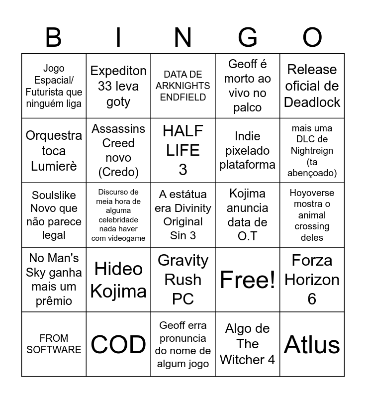 This bingo card has 25 words: Hideo Kojima, Geoff erra pronuncia do nome de algum jogo, HALF LIFE 3, FROM SOFTWARE, Release oficial de Deadlock, Jogo Espacial/ Futurista que ninguém liga, Orquestra toca Lumierè, Expediton 33 leva goty, Kojima anuncia data de O.T, Gravity Rush PC, Indie pixelado plataforma, Soulslike Novo que não parece legal, Free!, Forza Horizon 6, Assassins Creed novo (Credo), Atlus, Hoyoverse mostra o animal crossing deles, DATA DE ARKNIGHTS ENDFIELD, mais uma DLC de Nightreign (ta abençoado), Discurso de meia hora de alguma celebridade nada haver com videogame, A estátua era Divinity Original Sin 3, COD, No Man's Sky ganha mais um prêmio, Geoff é morto ao vivo no palco and Algo de The Witcher 4.