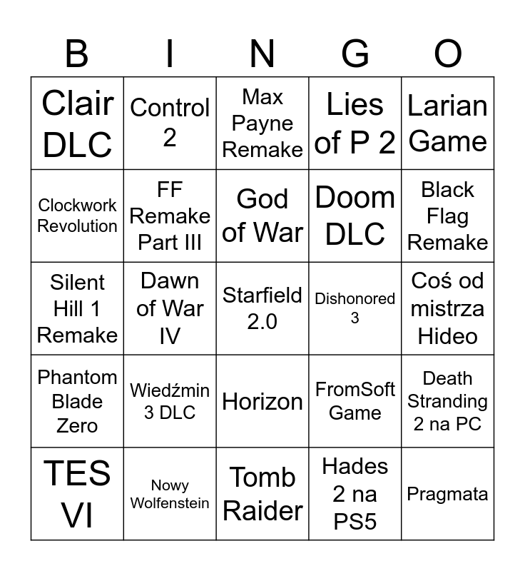 This bingo card has 25 words: Wiedźmin 3 DLC, Tomb Raider, God of War, TES VI, Larian Game, Clair DLC, Clockwork Revolution, Control 2, Dishonored 3, Horizon, Doom DLC, Silent Hill 1 Remake, FromSoft Game, Death Stranding 2 na PC, FF Remake Part III, Pragmata, Coś od mistrza Hideo, Max Payne Remake, Black Flag Remake, Dawn of War IV, Starfield 2.0, Nowy Wolfenstein, Phantom Blade Zero, Lies of P 2 and Hades 2 na PS5.