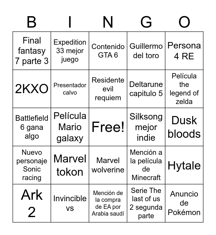 This bingo card has a free space and 24 words: Marvel tokon, Invincible vs, Residente evil requiem, Ark 2, Persona 4 RE, Final fantasy 7 parte 3, 2KXO, Expedition 33 mejor juego, Silksong mejor indie, Marvel wolverine, Deltarune capitulo 5, Battlefield 6 gana algo, Mención a la película de Minecraft, Hytale, Presentador calvo, Serie The last of us 2 segunda parte, Dusk bloods, Contenido GTA 6, Película the legend of zelda, Película Mario galaxy, Anuncio de Pokémon, Nuevo personaje Sonic racing, Guillermo del toro and Mención de la compra de EA por Arabia saudí.