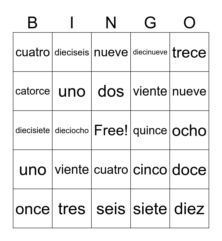 This bingo card has a free space and 24 words: once, viente, dos, siete, trece, cuatro, dieciseis, nueve, quince, ocho, diecisiete, uno, cinco, doce, catorce, tres, seis, diecinueve, nueve, uno, dieciocho, cuatro, viente and diez.
