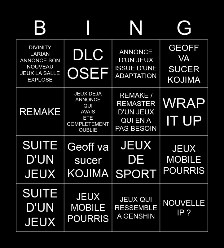 This bingo card has 21 words: JEUX MOBILE POURRIS, VICTOIRE FRAUDULEUSE, DLC OSEF, CLAIR OBSCUR GAGNE TOUT, JEUX QUI RESSEMBLE A GENSHIN, REMAKE / REMASTER D'UN JEUX QUI EN A PAS BESOIN, DIVINITY LARIAN ANNONCE SON NOUVEAU JEUX LA SALLE EXPLOSE, ANNONCE D'UN JEUX ISSUE D'UNE ADAPTATION, JEUX DE SPORT, WRAP IT UP, SUITE D'UN JEUX, GEOFF VA SUCER KOJIMA, NOUVELLE IP ?, UN SOULS LIKE (SVP), JEUX DEJA ANNONCE QUI AVAIS ETE COMPLETEMENT OUBLIE, UNE PERSONNE VA REUSSIR A S'INCRUSTER SUR SCENE, SUITE D'UN JEUX, Geoff va sucer KOJIMA, REMAKE, JEUX MOBILE POURRIS and WRAP IT UP.