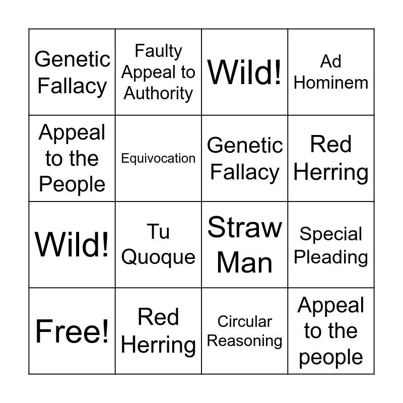 This bingo card has 16 words: Red Herring, Special Pleading, Wild!, Genetic Fallacy, Wild!, Faulty Appeal to Authority, Straw Man, Circular Reasoning, Appeal to the People, Equivocation, Free!, Ad Hominem, Tu Quoque, Red Herring, Genetic Fallacy and Appeal to the people.