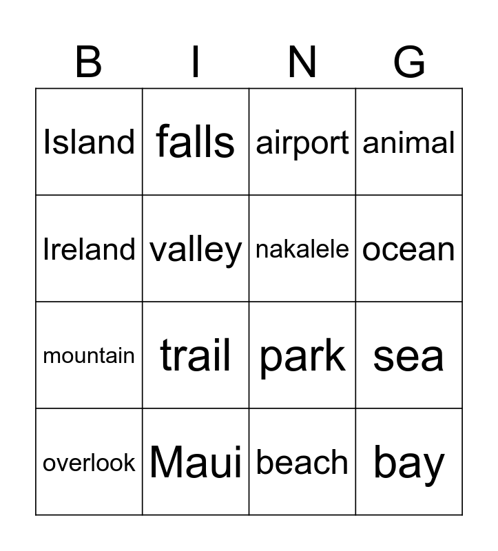 This bingo card has 16 words: Maui, sea, airport, Island, mountain, falls, park, beach, Ireland, valley, overlook, animal, trail, ocean, nakalele and bay.
