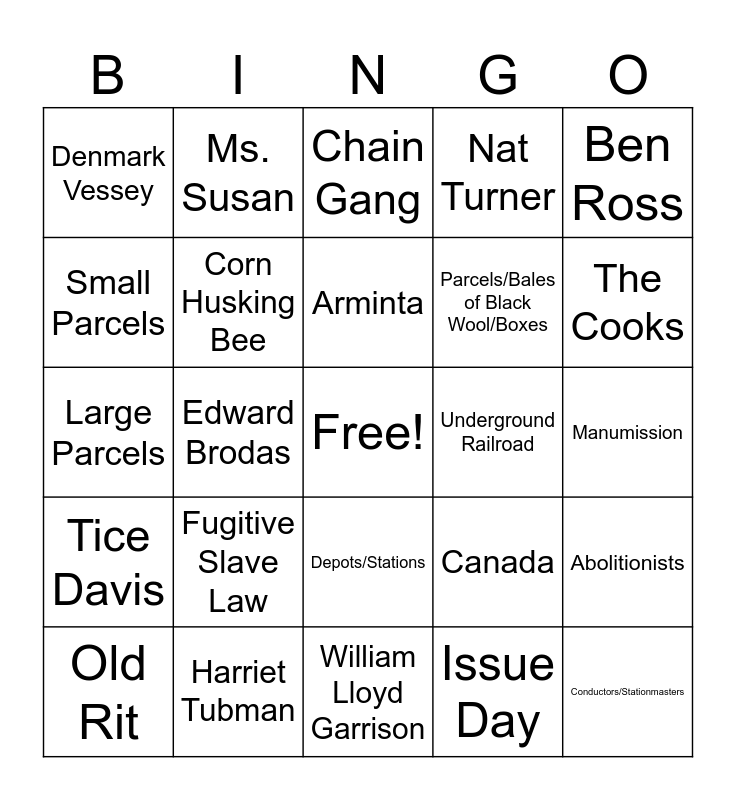 This bingo card has a free space and 24 words: Fugitive Slave Law, Harriet Tubman, Arminta, Old Rit, Ben Ross, Denmark Vessey, Small Parcels, Ms. Susan, Underground Railroad, Depots/Stations, Parcels/Bales of Black Wool/Boxes, Large Parcels, Canada, Abolitionists, Corn Husking Bee, Issue Day, Manumission, Chain Gang, The Cooks, Edward Brodas, Conductors/Stationmasters, Tice Davis, Nat Turner and William Lloyd Garrison.