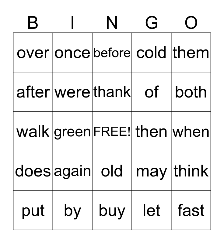 This bingo card has a free space and 24 words: again, by, thank, put, them, over, after, once, then, old, of, walk, may, think, were, let, when, before, both, green, fast, does, cold and buy.