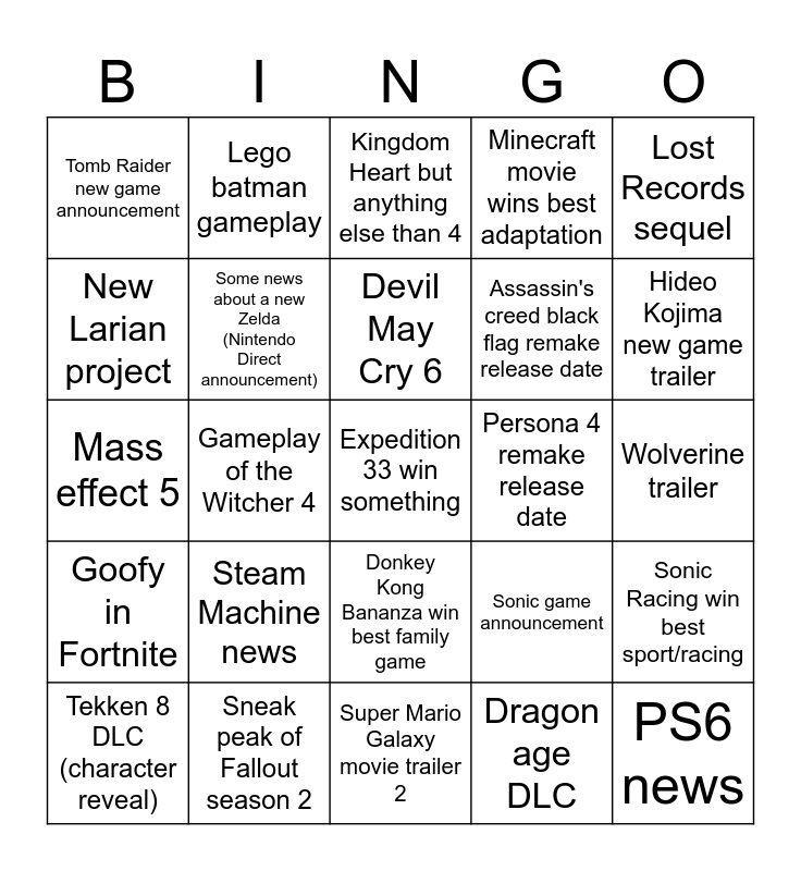 This bingo card has a free space and 24 words: Steam Machine news, Sneak peak of Fallout season 2, Devil May Cry 6, Tekken 8 DLC (character reveal), Lost Records sequel, Tomb Raider new game announcement, New Larian project, Lego batman gameplay, Persona 4 remake release date, Donkey Kong Bananza win best family game, Assassin's creed black flag remake release date, Mass effect 5, Sonic game announcement, Sonic Racing win best sport/racing, Some news about a new Zelda (Nintendo Direct announcement), Dragon age DLC, Wolverine trailer, Kingdom Heart but anything else than 4, Hideo Kojima new game trailer, Gameplay of the Witcher 4, PS6 news, Goofy in Fortnite, Minecraft movie wins best adaptation and Super Mario Galaxy movie trailer 2.
