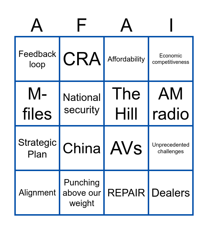 This bingo card has 20 words: Unprecedented challenges, Thought leadership, Affordability, PFAS, Alignment, M-files, Punching above our weight, Feedback loop, Strategic Plan, CRA, China, AVs, National security, Dealers, The Hill, F1, AM radio, Economic competitiveness, REPAIR and Fully staffed.
