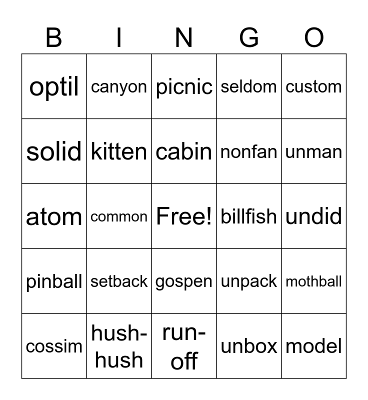 This bingo card has a free space and 75 words: index, cobweb, picnic, sunset, public, habit, robin, hilltop, album, within, rapid, visit, cabin, solid, bedbug, common, seven, model, signal, custom, fossil, atom, kitten, canyon, seldom, happen, mental, tunnel, cotton, novel, midship, nonfat, unlock, unpack, unman, nonfan, unpin, misluck, undid, unbox, undock, uncut, unfit, transfix, miscall, vamtish, cossim, optil, nixib, tonbit, hapmon, gospen, shotlet, velvin, chimtep, tipdex, ziglid, maxip, pinmus, lommet, setback, potluck, well-off, singsong, backup, billfish, rip-off, batfish, kickback, mothball, pinball, hush-hush, pillbox, run-off and backlog.