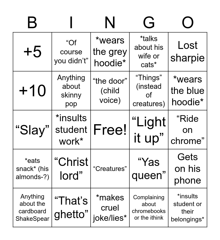 This bingo card has a free space and 24 words: “Christ lord”, “That’s ghetto”, “the door” (child voice), Anything about the cardboard ShakeSpear, Lost sharpie, +5, +10, “Of course you didn’t”, “Light it up”, “Creatures”, “Things” (instead of creatures), “Slay”, “Yas queen”, Gets on his phone, Anything about skinny pop, Complaining about chromebooks or the ithink, “Ride on chrome”, *wears the grey hoodie*, *wears the blue hoodie*, *insults student work*, *insults student or their belongings*, *eats snack* (his almonds-?), *talks about his wife or cats* and *makes cruel joke/lies*.