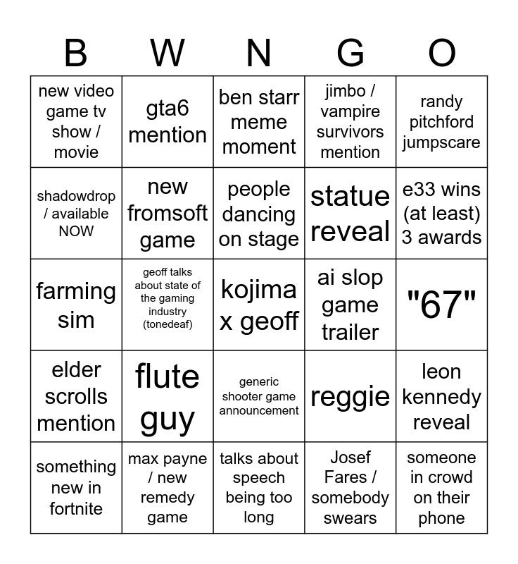 This bingo card has a free space and 31 words: talks about speech being too long, random celebrity speaker??, geoff talks about state of the gaming industry (tonedeaf), muppets, new video game tv show / movie, ben starr meme moment, new fromsoft game, reggie, ai slop game trailer, Josef Fares / somebody swears, "67", someone in crowd on their phone, vtuber shows up, world premiere for a game already announced, e33 wins (at least) 3 awards, trailer framerate / technical issues, leon kennedy reveal, flute guy, elder scrolls mention, generic shooter game announcement, randy pitchford jumpscare, incredible drip/style, something new in fortnite, gta6 mention, statue reveal, shadowdrop / available NOW, jimbo / vampire survivors mention, farming sim, max payne / new remedy game, people dancing on stage and presenter joke falls flat.