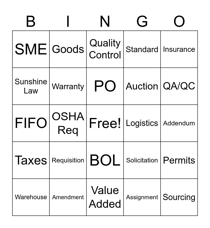 This bingo card has a free space and 32 words: Assignment, Quality, OSHA Req, Payment Term, Taxes, Warranty, Insurance, Permits, Goods, Service, PO, Quality Control, Delivery, Lump Sum, Logistics, Contract, Warehouse, FIFO, BOL, Requisition, Solicitation, Supply Chain, Addendum, Amendment, Sourcing, Standard, Auction, Sunshine Law, SME, Value Added, T&Cs and QA/QC.