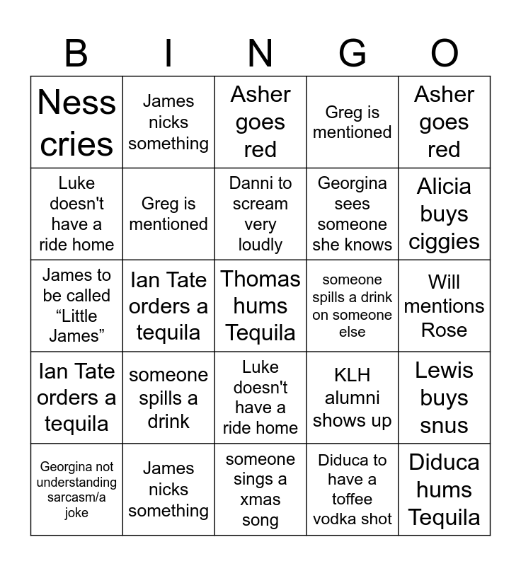 This bingo card has 52 words: someone falls over, Thomas hums Tequila, Liv pinches a stranger's xmas headwear, someone sings a xmas song, someone spills a drink, someone falls over, James nicks something, Georgina not understanding sarcasm, Luke doesn't have a ride home, someone complains about the choice of pubs, Greg is mentioned, Will mentions Rose, Lewis buys snus, KLH alumni shows up, Georgina sees someone she knows, Lori asks for a selfie with someone, Danni to scream very loudly, someone spills a drink on someone else, Lewis split the “G”, Asher goes red, Ian Tate orders a tequila, Diduca to have a toffee vodka shot, Ness cries, Georgina sees someone she knows, Lewis buys snus, Diduca hums Tequila, someone falls over, Liv pinches a stranger's xmas headwear, Alicia buys ciggies, somebody complains about the choice of pubs, Someone spills a drink on themselves, Greg is mentioned, "Steevoo!" to be said 3 times, KLH alumni shows up, someone spills a drink, Asher goes red, James nicks something, Steve says "jacket potato", someone spills a drink on someone else, Ness cries, Lori asks for a selfie with someone, Will mentions Rose, Ian Tate orders a tequila, someone sings a xmas song, Luke doesn't have a ride home, Liv to mention winebar, Diduca to have a toffee vodka shot, James to be called “Little James”, Diduca to do his hugsy impression, Danni to scream very loudly, Georgina not understanding sarcasm/a joke and Lewis splits the “G”.
