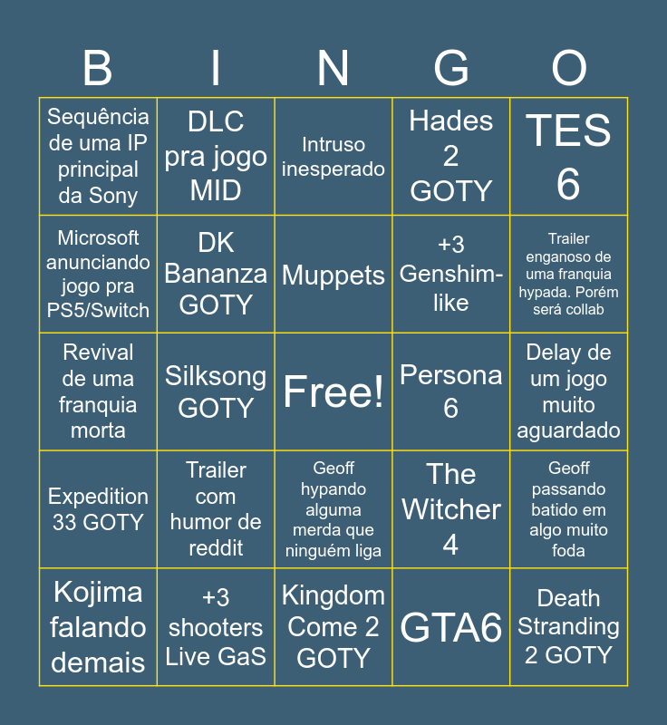 This bingo card has a free space and 24 words: Trailer com humor de reddit, +3 shooters Live GaS, Muppets, Kojima falando demais, TES 6, Sequência de uma IP principal da Sony, Microsoft anunciando jogo pra PS5/Switch, DLC pra jogo MID, Persona 6, Geoff hypando alguma merda que ninguém liga, +3 Genshim-like, Revival de uma franquia morta, The Witcher 4, Geoff passando batido em algo muito foda, DK Bananza GOTY, GTA6, Delay de um jogo muito aguardado, Intruso inesperado, Trailer enganoso de uma franquia hypada. Porém será collab, Silksong GOTY, Death Stranding 2 GOTY, Expedition 33 GOTY, Hades 2 GOTY and Kingdom Come 2 GOTY.