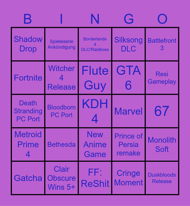 This bingo card has a free space and 24 words: Bethesda, Clair Obscure Wins 5+, Flute Guy, Gatcha, Battlefront 3, Shadow Drop, Fortnite, Spieleserie Ankündigung, Marvel, New Anime Game, GTA 6, Death Stranding PC Port, Prince of Persia remake, Monolith Soft, Witcher 4 Release, Cringe Moment, 67, Borderlands 4 DLC/Raidboss, Resi Gameplay, Bloodborn PC Port, Duskbloods Release, Metroid Prime 4, Silksong DLC and FF: ReShit.