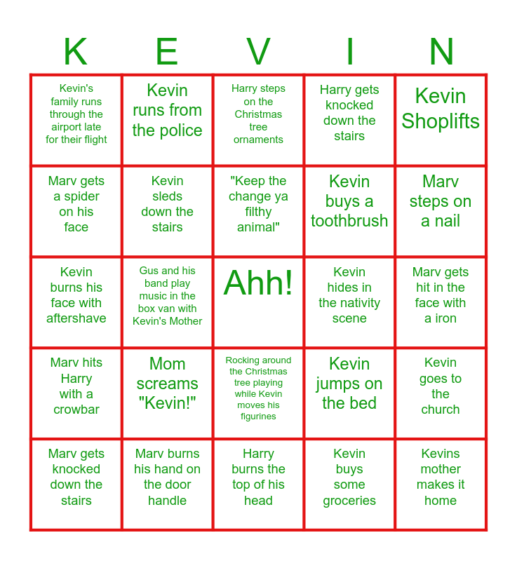 This bingo card has a free space and 24 words: Mom screams "Kevin!", Marv burns his hand on the door handle, "Keep the change ya filthy animal", Marv gets knocked down the stairs, Kevin Shoplifts, Kevin's family runs through the airport late for their flight, Marv gets a spider on his face, Kevin runs from the police, Kevin hides in the nativity scene, Rocking around the Christmas tree playing while Kevin moves his figurines, Kevin buys a toothbrush, Kevin burns his face with aftershave, Kevin jumps on the bed, Kevin goes to the church, Kevin sleds down the stairs, Kevin buys some groceries, Marv gets hit in the face with a iron, Harry steps on the Christmas tree ornaments, Marv steps on a nail, Gus and his band play music in the box van with Kevin's Mother, Kevins mother makes it home, Marv hits Harry with a crowbar, Harry gets knocked down the stairs and Harry burns the top of his head.