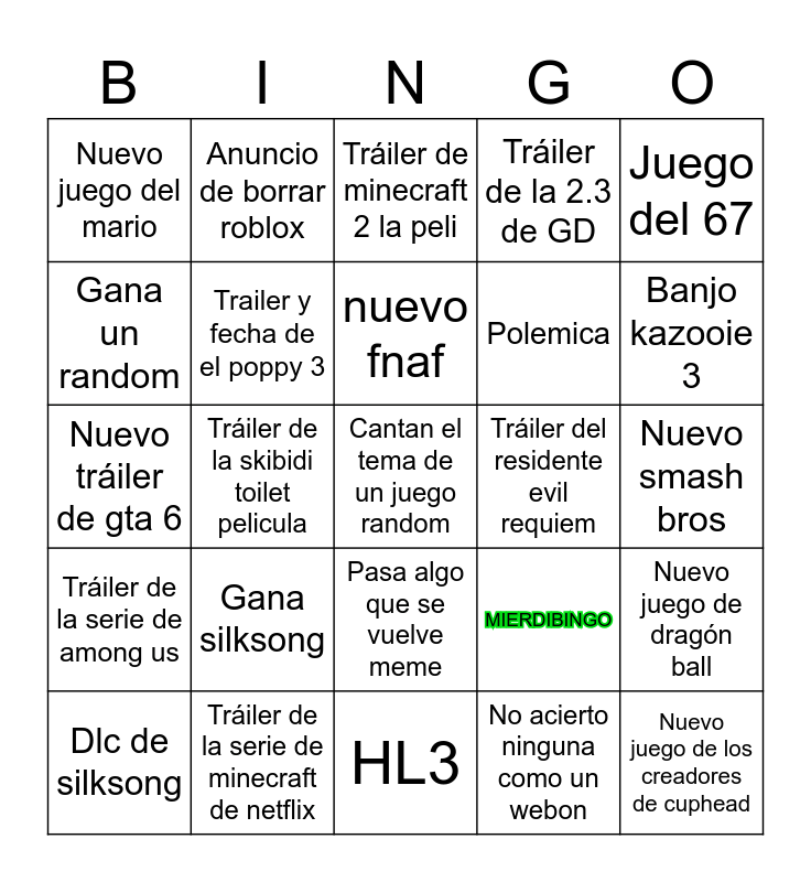 This bingo card has 25 words: Gana silksong, HL3, nuevo fnaf, Dlc de silksong, Juego del 67, Nuevo juego del mario, Gana un random, Anuncio de borrar roblox, Tráiler del residente evil requiem, Pasa algo que se vuelve meme, Polemica, Nuevo tráiler de gta 6, MIERDIBINGO, Nuevo juego de dragón ball, Trailer y fecha de el poppy 3, Nuevo juego de los creadores de cuphead, Nuevo smash bros, Tráiler de minecraft 2 la peli, Banjo kazooie 3, Tráiler de la skibidi toilet pelicula, Cantan el tema de un juego random, Tráiler de la serie de minecraft de netflix, Tráiler de la serie de among us, Tráiler de la 2.3 de GD and No acierto ninguna como un webon.