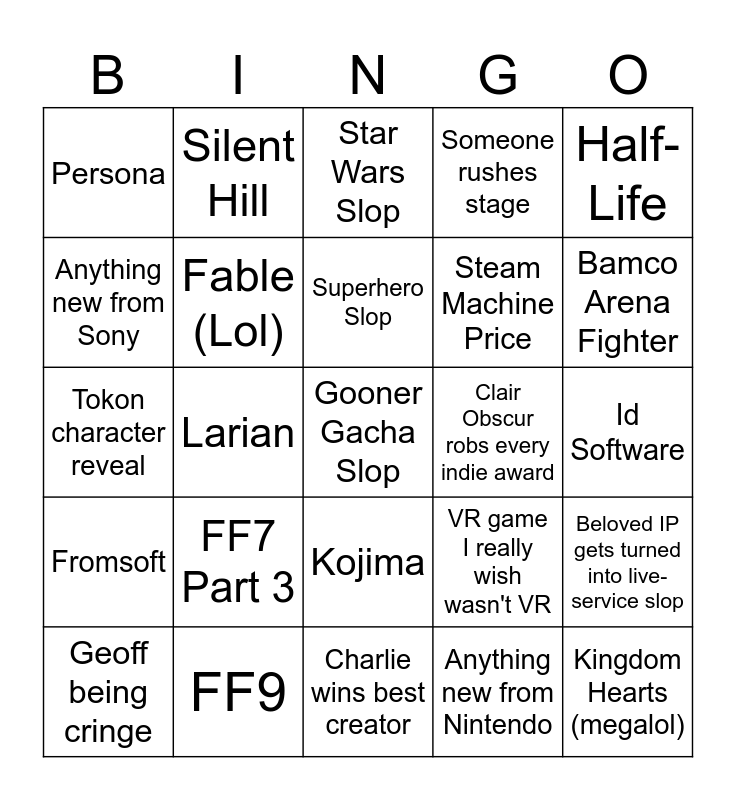 This bingo card has a free space and 24 words: FF7 Part 3, FF9, Superhero Slop, Geoff being cringe, Half-Life, Persona, Anything new from Sony, Silent Hill, Clair Obscur robs every indie award, Kojima, Steam Machine Price, Tokon character reveal, VR game I really wish wasn't VR, Beloved IP gets turned into live-service slop, Fable (Lol), Anything new from Nintendo, Id Software, Star Wars Slop, Bamco Arena Fighter, Larian, Kingdom Hearts (megalol), Fromsoft, Someone rushes stage and Charlie wins best creator.