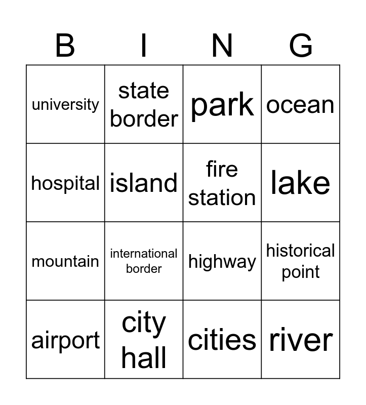 This bingo card has 16 words: city hall, historical point, park, university, mountain, state border, highway, cities, hospital, island, airport, ocean, international border, lake, fire station and river.