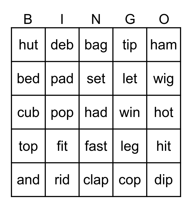 This bingo card has a free space and 24 words: fit, rid, set, and, ham, hut, bed, deb, win, fast, let, cub, leg, hit, pad, cop, hot, bag, wig, pop, dip, top, tip and clap.