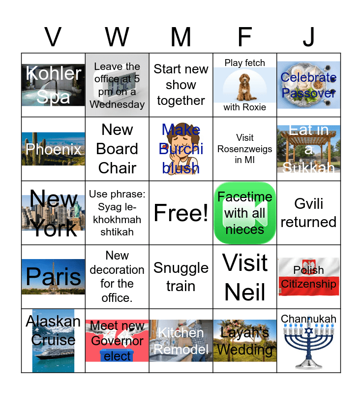This bingo card has 16 images, a free space and 24 words: Alaskan Cruise, New decoration for the office., Make Burchi blush, Layah's Wedding, Celebrate Passover, Kohler Spa, Leave the office at 5 pm on a Wednesday, Start new show together, Facetime with all nieces, Gvili returned, New York, New Board Chair, Visit Neil, Polish Citizenship, Phoenix, Meet new Governor elect, Kitchen Remodel, Play fetch with Roxie, Eat in a Sukkah, Paris, Use phrase: Syag le-khokhmah shtikah, Snuggle train, Visit Rosenzweigs in MI and Channukah.