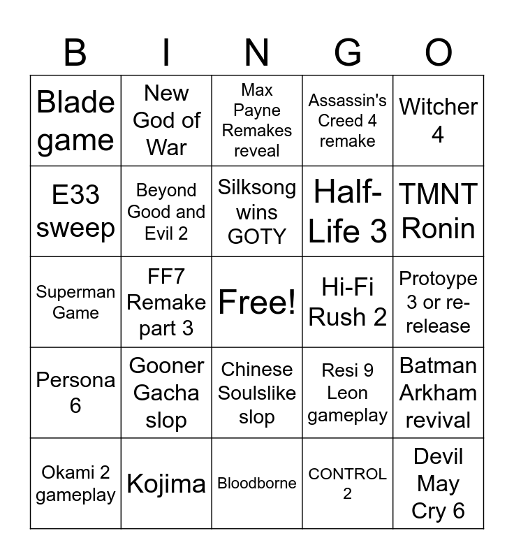 This bingo card has a free space and 24 words: Gooner Gacha slop, Kojima, Silksong wins GOTY, Okami 2 gameplay, Witcher 4, Blade game, E33 sweep, New God of War, Hi-Fi Rush 2, Chinese Soulslike slop, Half-Life 3, Superman Game, Resi 9 Leon gameplay, Batman Arkham revival, Beyond Good and Evil 2, CONTROL 2, Protoype 3 or re-release, Max Payne Remakes reveal, TMNT Ronin, FF7 Remake part 3, Devil May Cry 6, Persona 6, Assassin's Creed 4 remake and Bloodborne.