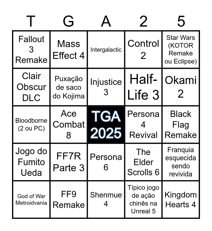 This bingo card has a free space and 24 words: FF7R Parte 3, FF9 Remake, Injustice 3, God of War Metroidvania, Star Wars (KOTOR Remake ou Eclipse), Fallout 3 Remake, Clair Obscur DLC, Mass Effect 4, Persona 4 Revival, Persona 6, Half-Life 3, Bloodborne (2 ou PC), The Elder Scrolls 6, Franquia esquecida sendo revivida, Puxação de saco do Kojima, Típico jogo de ação chinês na Unreal 5, Black Flag Remake, Intergalactic, Okami 2, Ace Combat 8, Kingdom Hearts 4, Jogo do Fumito Ueda, Control 2 and Shenmue 4.