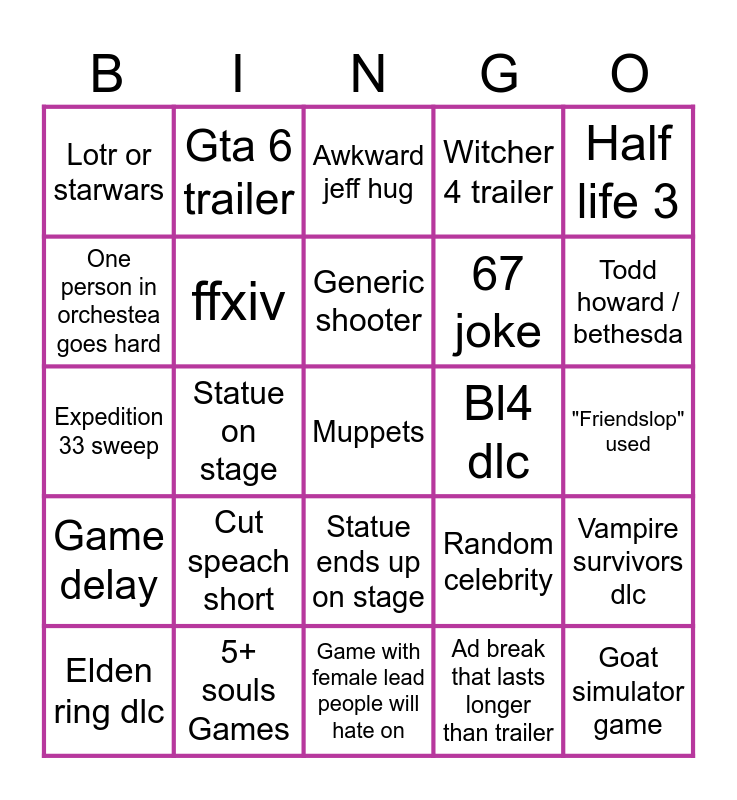 This bingo card has a free space and 24 words: Cut speach short, 5+ souls Games, Generic shooter, Elden ring dlc, Half life 3, Lotr or starwars, One person in orchestea goes hard, Gta 6 trailer, Bl4 dlc, Statue ends up on stage, 67 joke, Expedition 33 sweep, Random celebrity, Vampire survivors dlc, ffxiv, Ad break that lasts longer than trailer, "Friendslop" used, Awkward jeff hug, Todd howard / bethesda, Statue on stage, Goat simulator game, Game delay, Witcher 4 trailer and Game with female lead people will hate on.