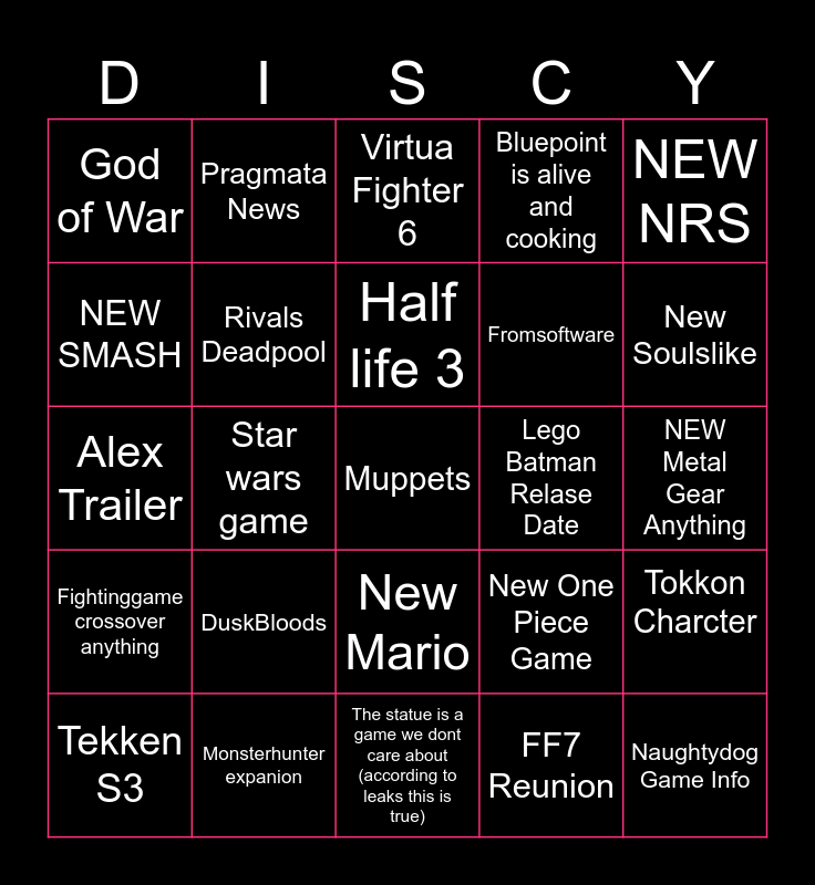 This bingo card has a free space and 24 words: DuskBloods, Monsterhunter expanion, Half life 3, Tekken S3, NEW NRS, God of War, NEW SMASH, Pragmata News, Lego Batman Relase Date, New Mario, Fromsoftware, Alex Trailer, New One Piece Game, Tokkon Charcter, Rivals Deadpool, FF7 Reunion, NEW Metal Gear Anything, Virtua Fighter 6, New Soulslike, Star wars game, Naughtydog Game Info, Fightinggame crossover anything, Bluepoint is alive and cooking and The statue is a game we dont care about (according to leaks this is true).