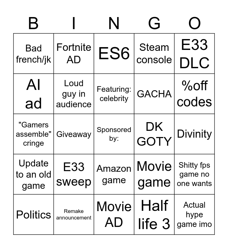 This bingo card has a free space and 24 words: E33 sweep, Remake announcement, Featuring: celebrity, Politics, E33 DLC, Bad french/jk, AI ad, Fortnite AD, DK GOTY, Amazon game, GACHA, "Gamers assemble" cringe, Movie game, Shitty fps game no one wants, Loud guy in audience, Half life 3, Divinity, ES6, %off codes, Giveaway, Actual hype game imo, Update to an old game, Steam console and Movie AD.