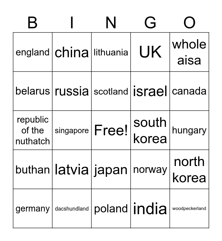 This bingo card has a free space and 34 words: albania, austria, belgium, netherlands, hungary, belarus, russia, poland, israel, woodpeckerland, republic of the nuthatch, china, india, nepal, buthan, singapore, japan, south korea, north korea, germany, dacshundland, bangladesh, UK, canada, estonia, latvia, lithuania, finland, whole aisa, england, wales, scotland, norway and whole europe.