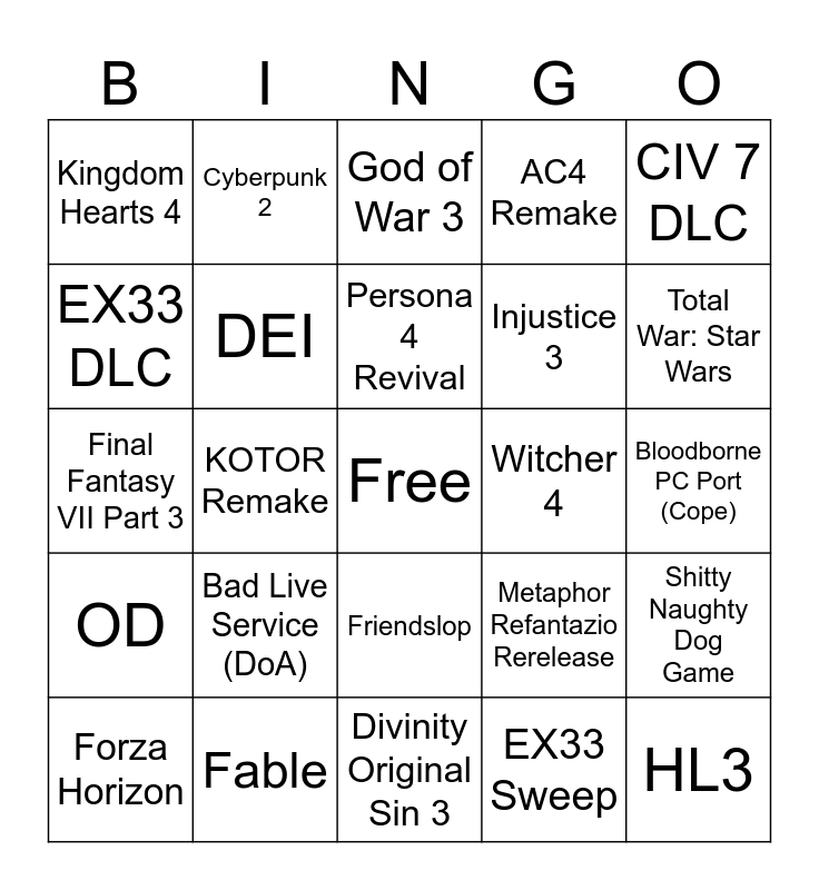 This bingo card has a free space and 24 words: Bad Live Service (DoA), Fable, Persona 4 Revival, Forza Horizon, CIV 7 DLC, Kingdom Hearts 4, EX33 DLC, Cyberpunk 2, Witcher 4, Friendslop, Injustice 3, Final Fantasy VII Part 3, Metaphor Refantazio Rerelease, Shitty Naughty Dog Game, DEI, EX33 Sweep, Bloodborne PC Port (Cope), God of War 3, Total War: Star Wars, KOTOR Remake, HL3, OD, AC4 Remake and Divinity Original Sin 3.