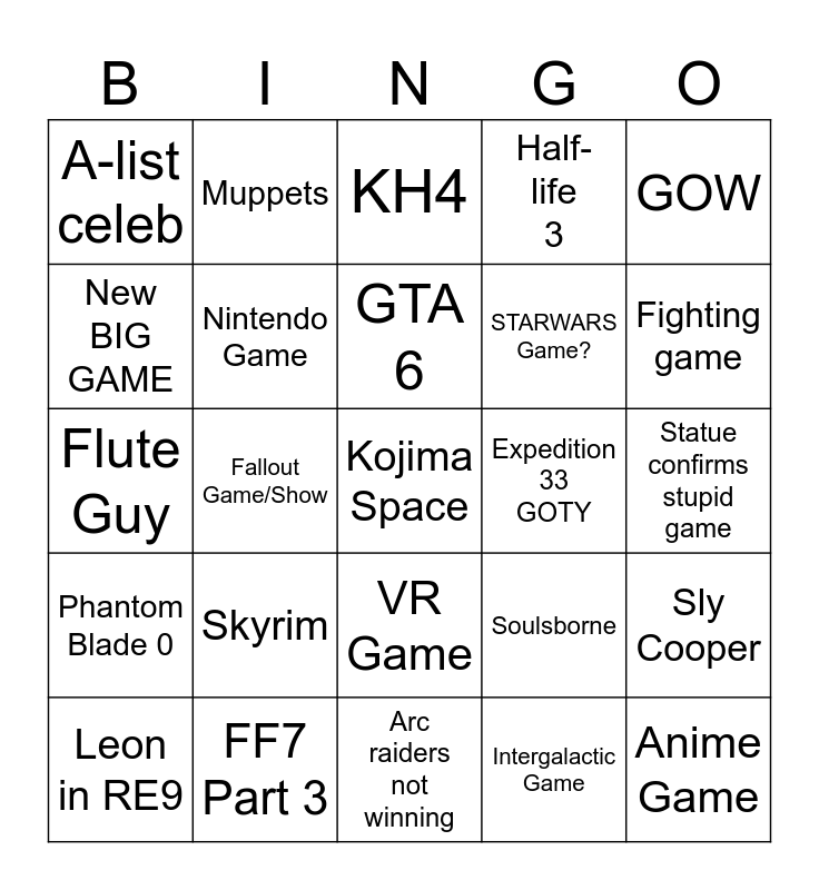 This bingo card has a free space and 24 words: Skyrim, FF7 Part 3, GTA 6, Leon in RE9, GOW, A-list celeb, New BIG GAME, Muppets, Expedition 33 GOTY, VR Game, STARWARS Game?, Flute Guy, Soulsborne, Sly Cooper, Nintendo Game, Intergalactic Game, Statue confirms stupid game, KH4, Fighting game, Fallout Game/Show, Anime Game, Phantom Blade 0, Half-life 3 and Arc raiders not winning.