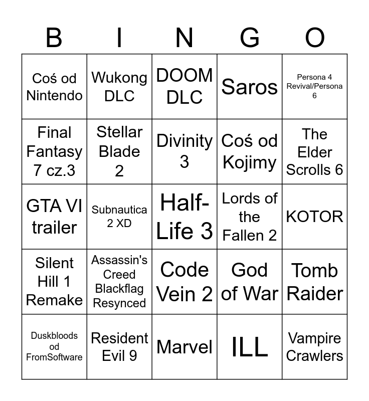This bingo card has a free space and 24 words: Assassin's Creed Blackflag Resynced, Resident Evil 9, Divinity 3, Duskbloods od FromSoftware, Persona 4 Revival/Persona 6, Coś od Nintendo, Final Fantasy 7 cz.3, Wukong DLC, Lords of the Fallen 2, Code Vein 2, Coś od Kojimy, GTA VI trailer, God of War, Tomb Raider, Stellar Blade 2, ILL, KOTOR, DOOM DLC, The Elder Scrolls 6, Subnautica 2 XD, Vampire Crawlers, Silent Hill 1 Remake, Saros and Marvel.
