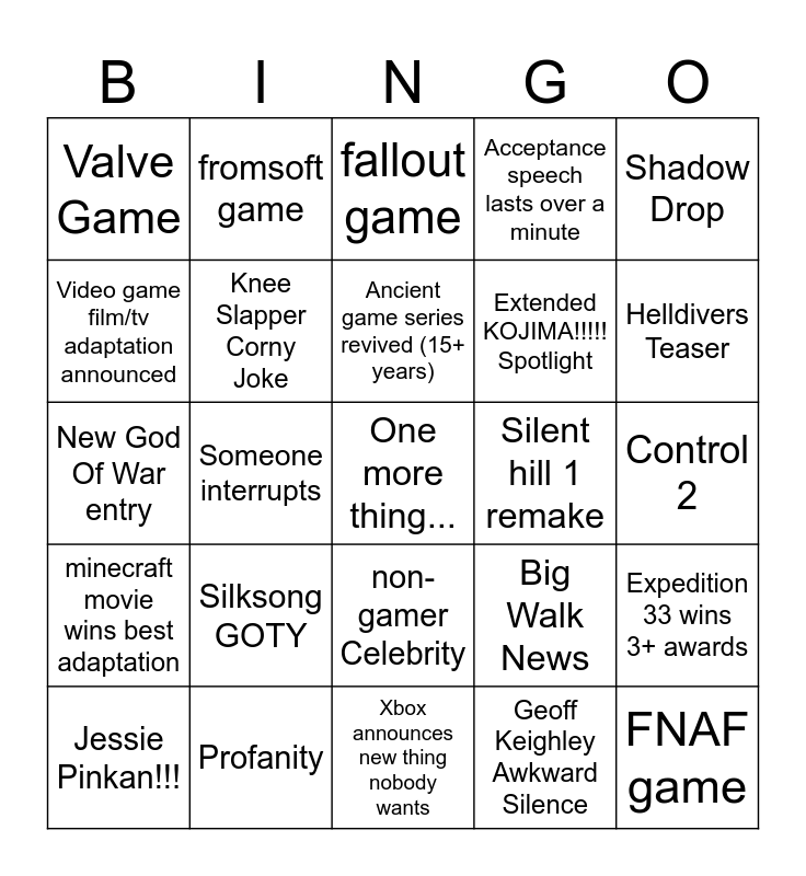 This bingo card has a free space and 24 words: Silksong GOTY, Profanity, Ancient game series revived (15+ years), Jessie Pinkan!!!, Shadow Drop, Valve Game, Video game film/tv adaptation announced, fromsoft game, Silent hill 1 remake, non-gamer Celebrity, Extended KOJIMA!!!!! Spotlight, New God Of War entry, Big Walk News, Expedition 33 wins 3+ awards, Knee Slapper Corny Joke, Geoff Keighley Awkward Silence, Control 2, fallout game, Helldivers Teaser, Someone interrupts, FNAF game, minecraft movie wins best adaptation, Acceptance speech lasts over a minute and Xbox announces new thing nobody wants.