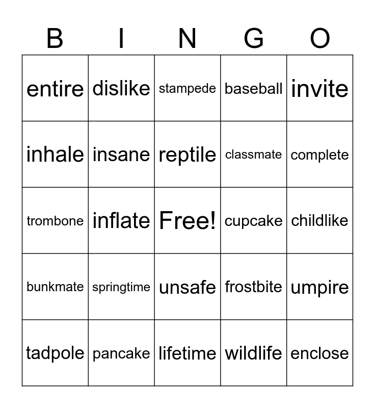 This bingo card has a free space and 24 words: springtime, pancake, reptile, tadpole, invite, entire, inhale, dislike, cupcake, unsafe, classmate, trombone, frostbite, umpire, insane, wildlife, childlike, stampede, complete, inflate, enclose, bunkmate, baseball and lifetime.