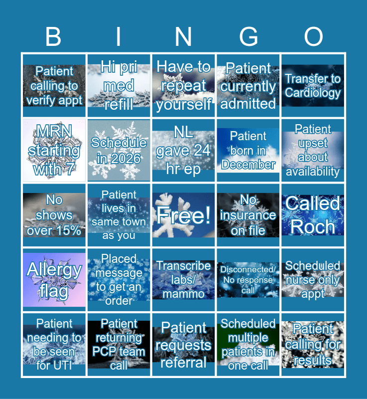 This bingo card has 24 images, a free space and 24 words: Placed message to get an order, Patient returning PCP team call, NL gave 24 hr ep, Patient needing to be seen for UTI, Transfer to Cardiology, Patient calling to verify appt, MRN starting with 7, Hi pri med refill, No insurance on file, Transcribe labs/ mammo, Patient born in December, No shows over 15%, Disconnected/ No response call, Scheduled nurse only appt, Schedule in 2026, Scheduled multiple patients in one call, Called Roch, Have to repeat yourself, Patient upset about availability, Patient lives in same town as you, Patient calling for results, Allergy flag, Patient currently admitted and Patient requests referral.