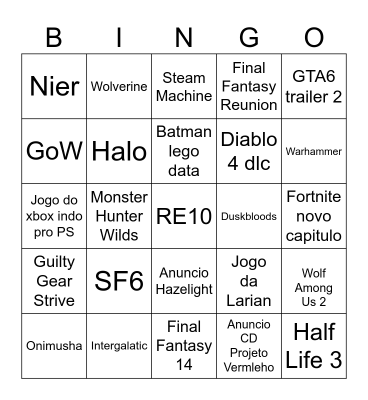 This bingo card has a free space and 24 words: SF6, Intergalatic, Batman lego data, Onimusha, GTA6 trailer 2, Nier, GoW, Wolverine, Duskbloods, Anuncio Hazelight, Diablo 4 dlc, Jogo do xbox indo pro PS, Jogo da Larian, Wolf Among Us 2, Halo, Anuncio CD Projeto Vermleho, Fortnite novo capitulo, Steam Machine, Warhammer, Monster Hunter Wilds, Half Life 3, Guilty Gear Strive, Final Fantasy Reunion and Final Fantasy 14.