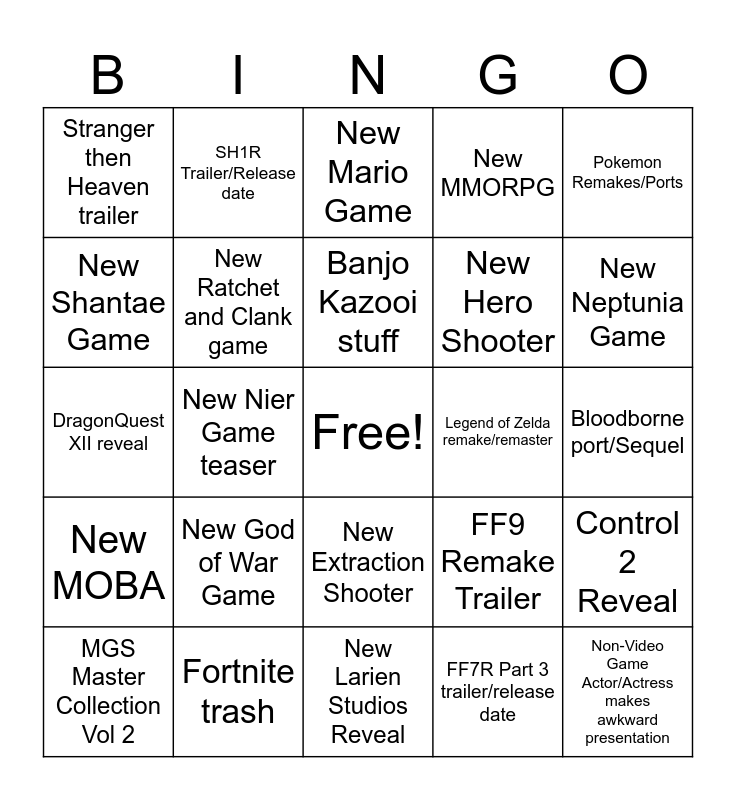 This bingo card has a free space and 24 words: New God of War Game, Fortnite trash, Banjo Kazooi stuff, MGS Master Collection Vol 2, Pokemon Remakes/Ports, Stranger then Heaven trailer, New Shantae Game, SH1R Trailer/Release date, Legend of Zelda remake/remaster, New Extraction Shooter, New Hero Shooter, DragonQuest XII reveal, FF9 Remake Trailer, Control 2 Reveal, New Ratchet and Clank game, FF7R Part 3 trailer/release date, Bloodborne port/Sequel, New Mario Game, New Neptunia Game, New Nier Game teaser, Non-Video Game Actor/Actress makes awkward presentation, New MOBA, New MMORPG and New Larien Studios Reveal.