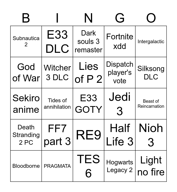 This bingo card has a free space and 24 words: FF7 part 3, PRAGMATA, Lies of P 2, Bloodborne, Intergalactic, Subnautica 2, God of War, E33 DLC, Jedi 3, RE9, Dispatch player's vote, Sekiro anime, Half Life 3, Nioh 3, Witcher 3 DLC, Hogwarts Legacy 2, Beast of Reincarnation, Dark souls 3 remaster, Silksong DLC, Tides of annihilation, Light no fire, Death Stranding 2 PC, Fortnite xdd and TES 6.
