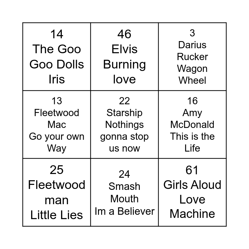 This bingo card has 80 words: 1 Barry Manilow Copacabana, 2 Abba Gimme, Gimme, Gimme, 3 Darius Rucker Wagon Wheel, 4 Noah Kahan Stick Season, 5 Westlife World of our own, 6 Geri Halliewell Its Raing men, 7 Nena 99 Red Balloons, 8 Westlife Uptown Girl, 9 Robbie Williams Angels, 10 Men Without Hats Safety Dance, 11 Grease Grease Megamix, 12 Abba Dancing Queen, 13 Fleetwood Mac Go your own Way, 14 The Goo Goo Dolls Iris, 15 The Temptations My Girl, 16 Amy McDonald This is the Life, 17 Fairground Attraction Perfect, 18 Simon & Garfunkal MRS Robinson, 19 Joan Jett I love rock & roll, 20 Joe Cocker Love lifts us up where we belong, 21 Amy Winehouse Valerie, 22 Starship Nothings gonna stop us now, 23 Bill Medley Ive had the time of my life, 24 Smash Mouth Im a Believer, 25 Fleetwood man Little Lies, 26 Marvin & Tammi Aint no mountain high enough, 27 Culture Club Karma Chameleon, 28 The Pogues Fairytale of new york, 29 Ike & Tina Proud Mary, 30 Los Lobos La Bamba, 31 Backstreet boys Everybody, 32 Dead or Alive you spin me round, 33 The Bangles Eternel Flame, 34 Dusty Springfield Son of a preacher man, 35 Huey Lewis Power of love, 36 Whitney Houston I wanna Dance with somebody, 37 Bonnie Tyler Holding out for a hero, 38 Shakin Stevens Merry Christmas Everybody, 39 Sony & Cher I got you babe, 40 Foundations Build me up buttercup, 41 Frankie Valli Grease, 42 Chuck Berry Johnny B Goode, 43 Oasis Wonderwall, 44 Don McLean Amercian Pie, 45 Walk the moon Shut up and Dance, 46 Elvis Burning love, 47 Rednex Cotton Eye Joe, 48 Oasis Dont look back in anger, 49 Madness Our House, 50 Backstreet Boys Quit playing games with my heart, 51 DJ Otzi Hey Baby, 52 The Beatles She Loves you, 53 Creedence Bad moon rising, 54 Dolly and Kenny Islands in the Stream, 55 Wheatus Teenage Dirtbag, 56 Ronan Keating Life is a rollercoaster, 57 Belinda Carlisle Heaven is a place on earth, 58 Eric Carmen Hungry Eyes, 59 Abba Mamma Mia, 60 The Cranberries Zombie, 61 Girls Aloud Love Machine, 62 Abba Waterloo, 63 The Cure Friday im in love, 64 White snake Here i go again on my own, 65 Hanson MMMbop, 66 SpiceGirls Wannabe, 67 Jason Mraz I'm Yours, 68 James Laid, 69 Nicki French Total Eclipse of the heart, 70 Divinyls I touch myself, 71 Waterboys Whole of the moon, 72 Rod Stewart Maggie May, 73 Rocky Horror The TIme Warp, 74 Wet, Wet, Wet Love is all around, 75 Alice Cooper Poison, 76 Ricky martin Livin la Vida Loca, 77 Adele Make you feel my Love, 78 Katrina and the Waves Walking on Sunshine, 79 The Darkness I believe in a thing called love and 80 Madonna Material Girl.
