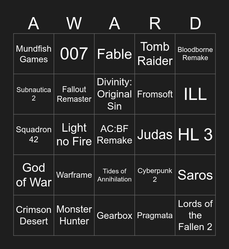 This bingo card has 25 words: Warframe, Gearbox, Divinity: Original Sin, Crimson Desert, Bloodborne Remake, Mundfish Games, Subnautica 2, 007, Judas, Tides of Annihilation, Fromsoft, Squadron 42, Cyberpunk 2, Saros, Fallout Remaster, Lords of the Fallen 2, HL 3, Fable, ILL, Light no Fire, AC:BF Remake, Monster Hunter, God of War, Tomb Raider and Pragmata.